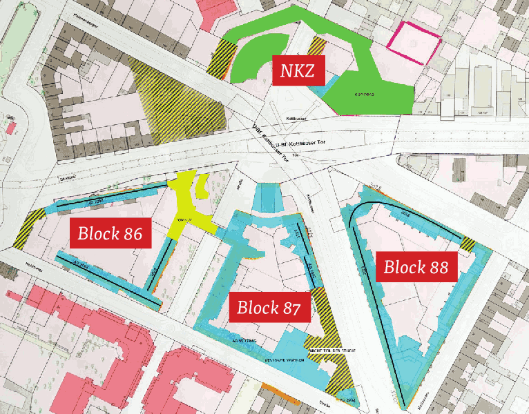 Das Untersuchungsgebiet Kottbusser Tor wurde für diese Studie so definiert, dass es die Gebäude im Eigentum der Deutschen Wohnen SE, der Gewobag AG und der Admiralstraße 16 Grundstücks GmbH & Co. KG 1 in den Blöcken 86, 87 und 88 sowie auf der Nordseite des Kottbusser Tors umfasst. Es wurden die Objekte nicht berücksichtigt, die in Eigentumswohnungen umgewandelt wurden oder andere Eigentümer*innen haben. Den Hintergrund dieser Studie bilden die Konflikte und der Mieter*innenprotest rund um den Sozialen Wohnungsbau und um die GSW/Deutsche Wohnen sowie die Kommunalisierung fast des gesamten Neuen Kreuzberg Zentrums. Auf diese Bestände konzentriert sich diese Studie.