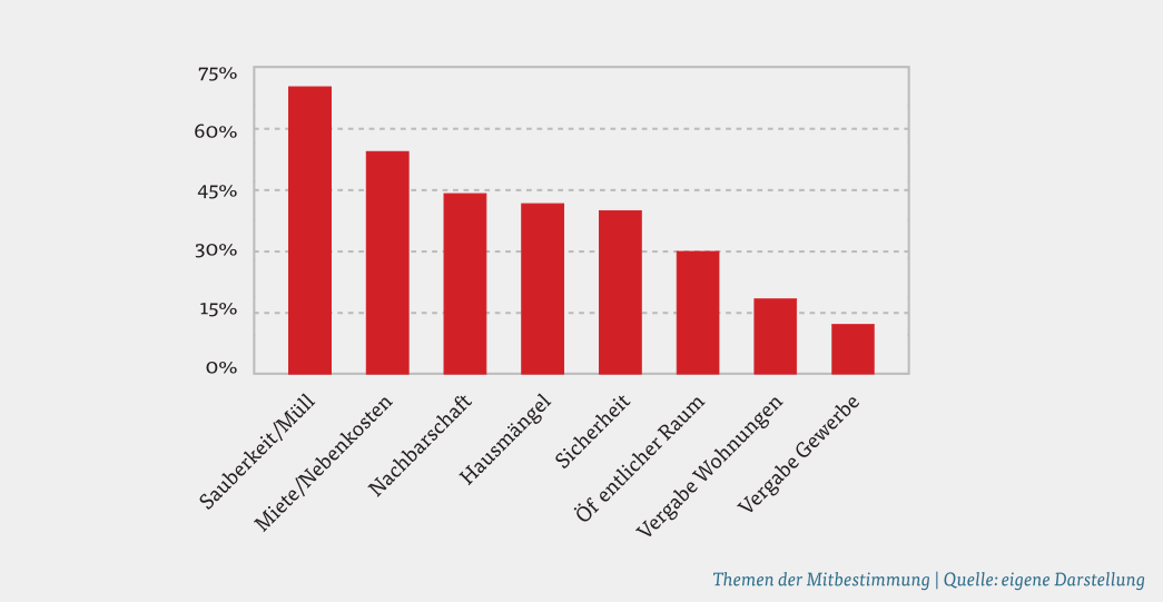 Die zwei meistgewählten Antwortmöglichkeiten bei der Frage „Wofür sollten sich die Mieter*innen vor allem engagieren?“ entsprechen direkt den wichtigsten Problemthemen. Die weiteren Themen deuten auf Mitbestimmungsinteressen hin, die neben dem nachbarschaftlichen Kontakt Entscheidungen über Instandhaltungs- und Bewirtschaftungsmaßnahmen betreffen. „Weiche“ Mitbestimmungsziele wie die Gestaltung des öffentlichen Raums oder die Gewerbestruktur spielen eine kleinere Rolle.