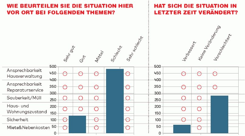 Die zwei Themen mit der größten Unzufriedenheit sind Sauberkeit/Müll und Miete/Nebenkosten. Dabei gibt es beim Thema Miete/Nebenkosten große Unterschiede je nach Vermieterin: Deutsche Wohnen-Mieter*innen urteilen zu 59% mit „schlecht“ oder „sehr schlecht“, während es im Neuen Kreuzberg Zentrum nur 24% sind. Nimmt man alle Bewertungen aller Themen zusammen, sind 53% der Beurteilungen „schlecht/sehr schlecht“ und nur 17% „gut/sehr gut“.