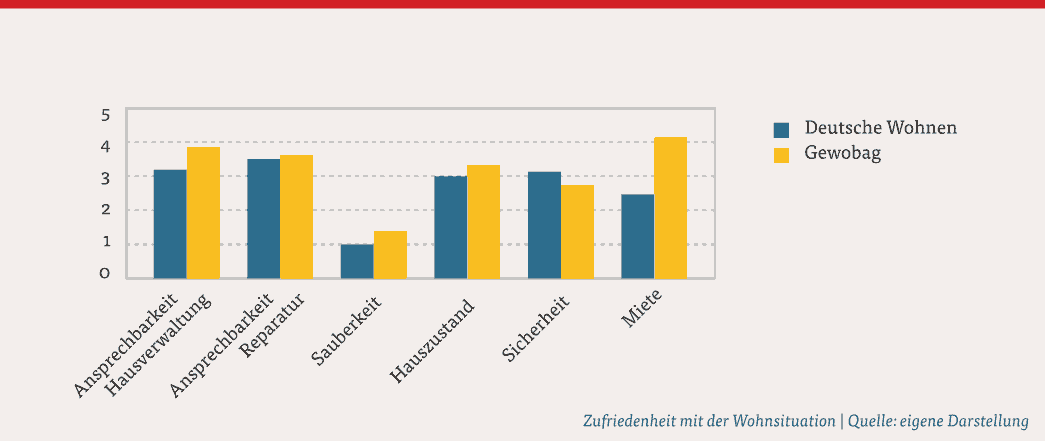In den Beständen der Deutschen Wohnen ist die Unzufriedenheit in allen Themen (außer Sicherheit) stärker, auch die tatsächliche Mietbelastung ist deutlich höher als im Neuen Kreuzberg Zentrum. Vom absehbaren Ende der Förderung im Sozialen Wohnungsbau abgesehen sind hier weitere Themen abzulesen, bei denen die Rückübertragung der Deutschen Wohnen-Bestände in die kommunale Hand die Wohnsituation verbessern könnte.